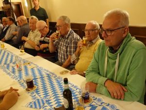 ![]() Alle verfügbaren Sänger und auch der Chorleiter sind erschienen, um zur Freude des Geburtstagskindes und seiner Gäste etwas aus dem Repertoire des Chores zu präsentieren. ![]() Ein kühler Trunk erfrischt die Sängerkehlen.